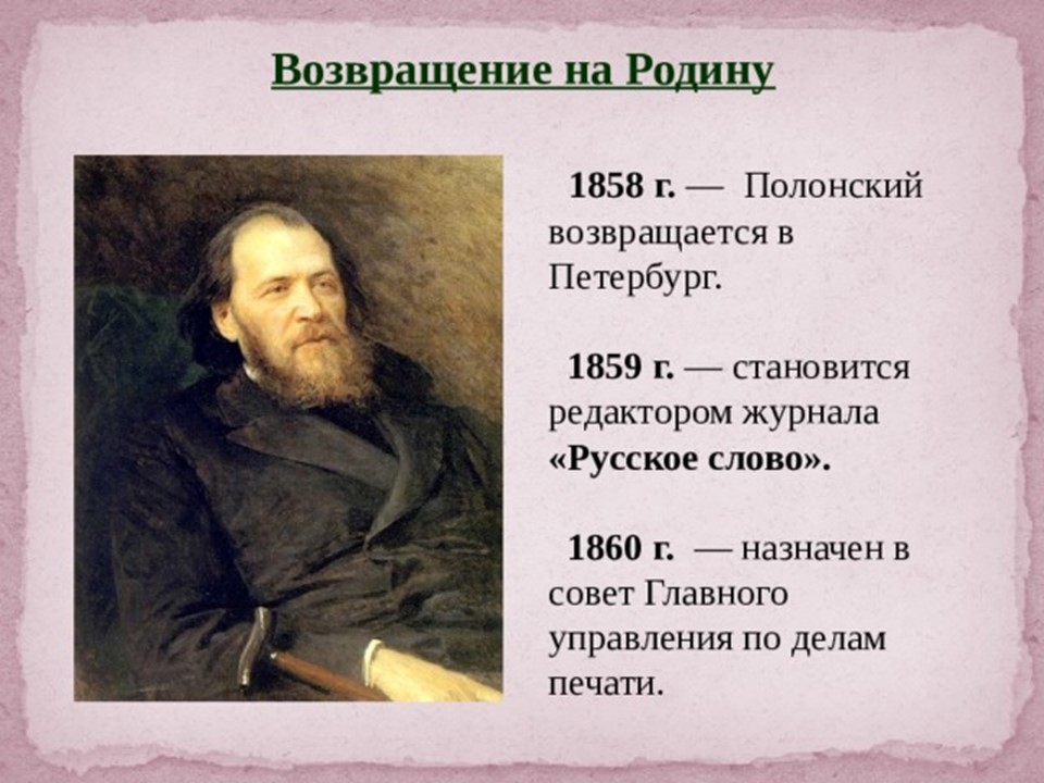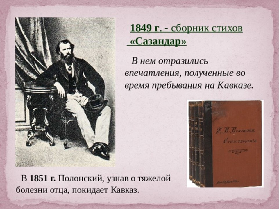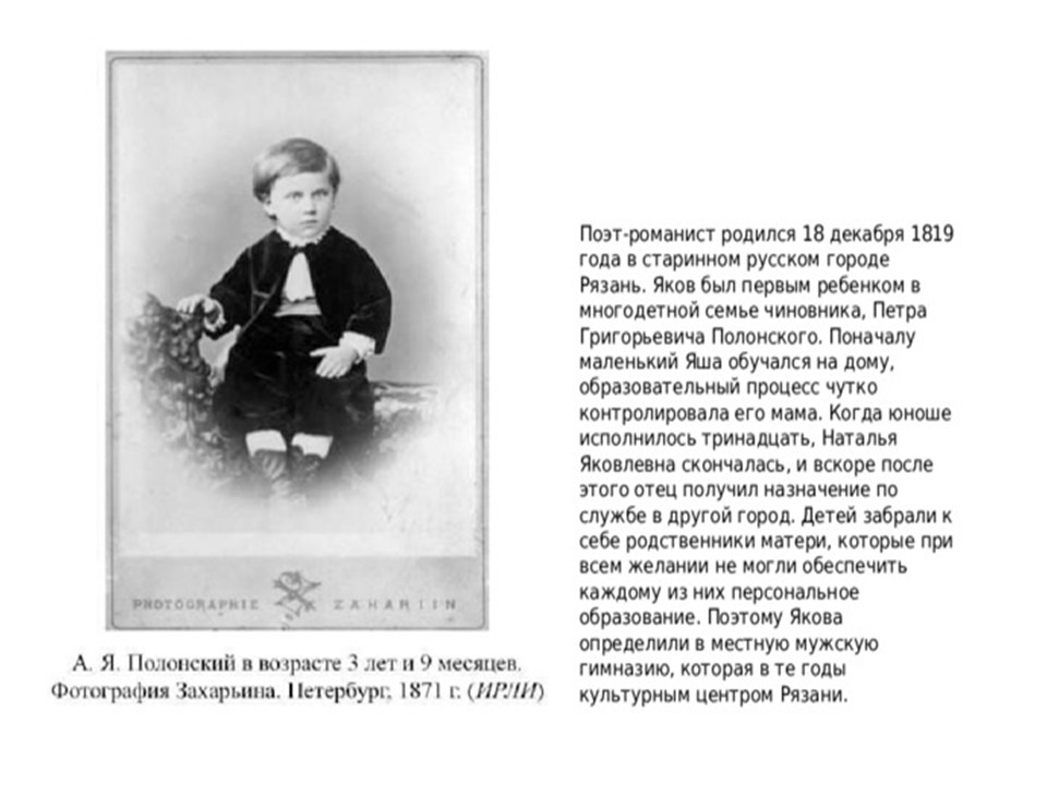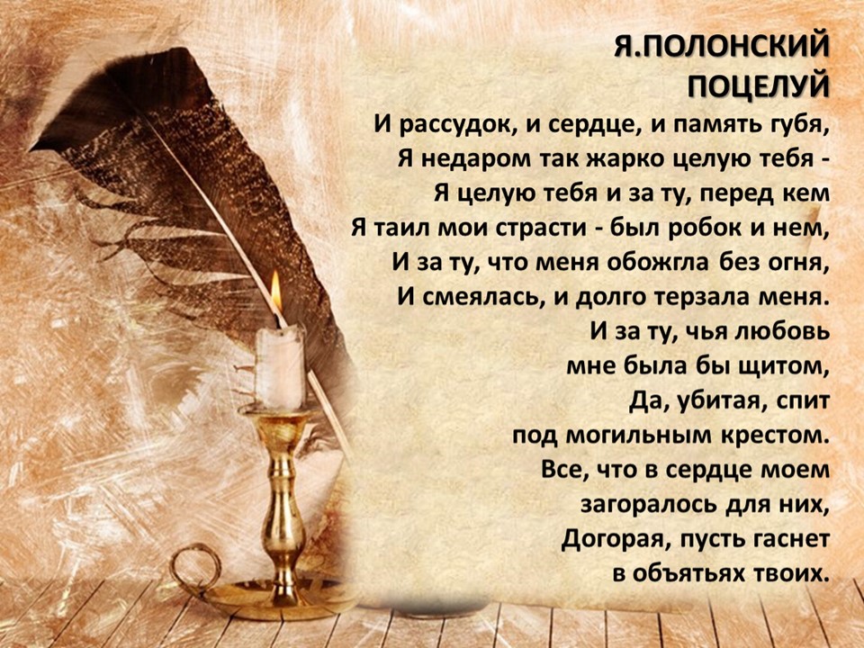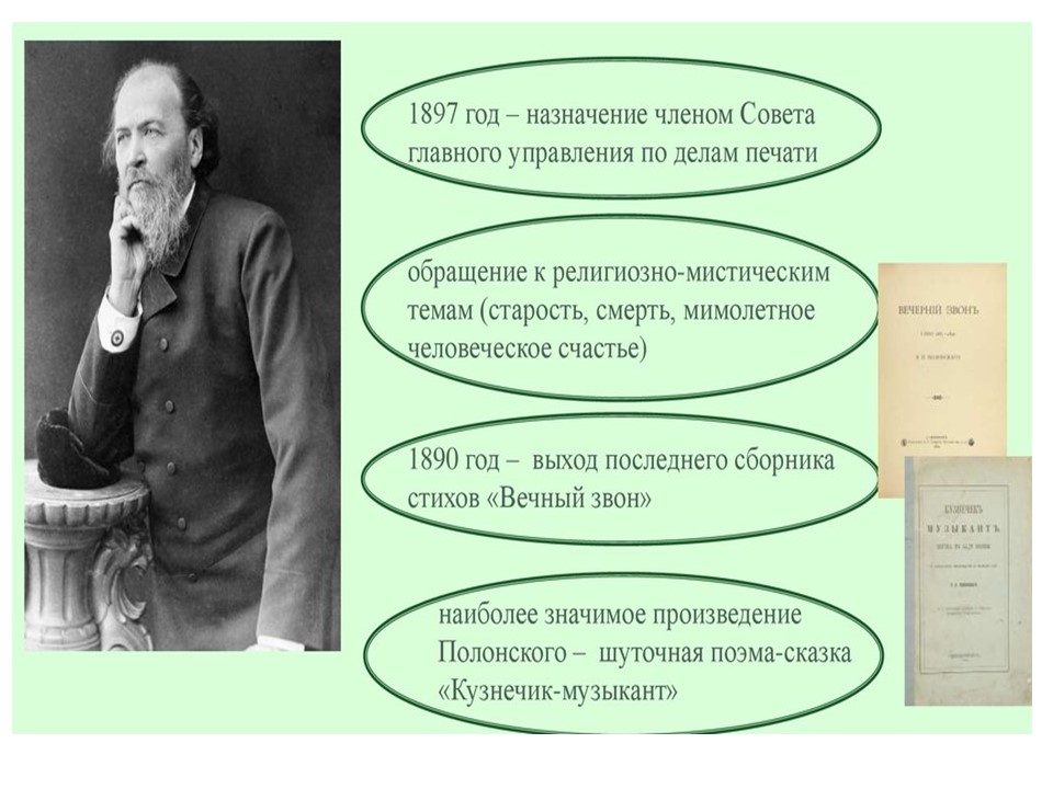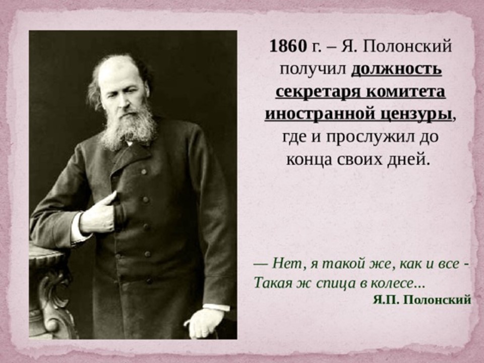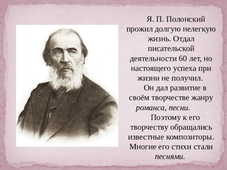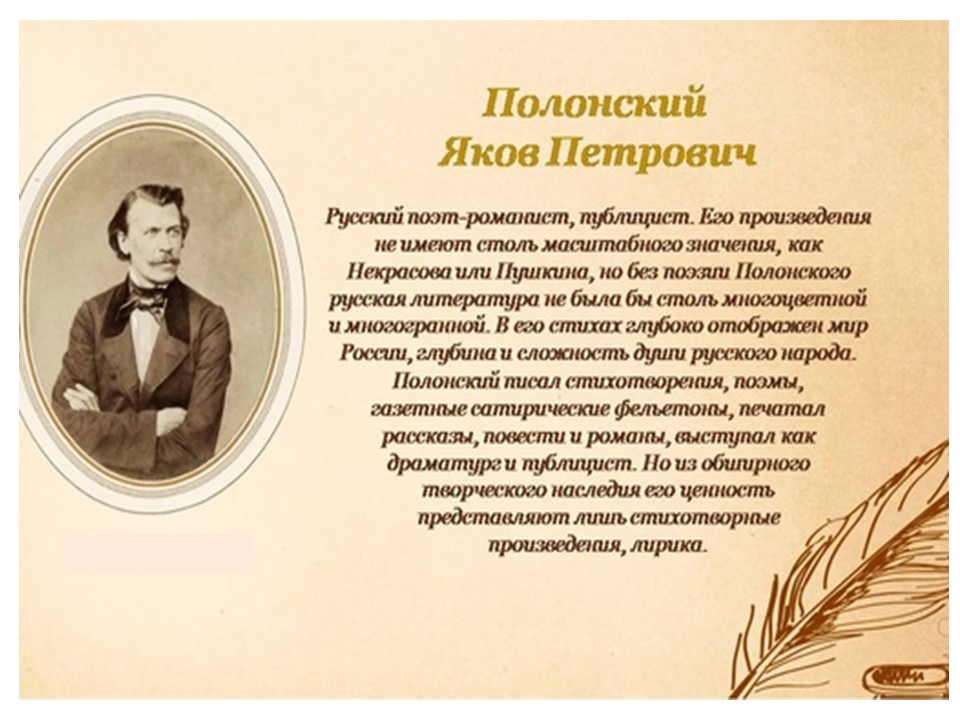 Я́ков Петро́вич Поло́нский (1819-1898) — русский поэт и прозаик. Член-корреспондент Петербургской академии наук (1886). Литературное наследие Полонского велико и включает в себя несколько сборников стихотворений, многочисленные поэмы, романы и рассказы. Множество его стихотворений было положено на музыку выдающимися русскими композиторами, ставших популярными романсами.