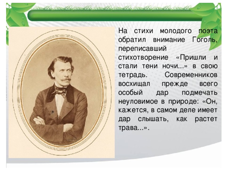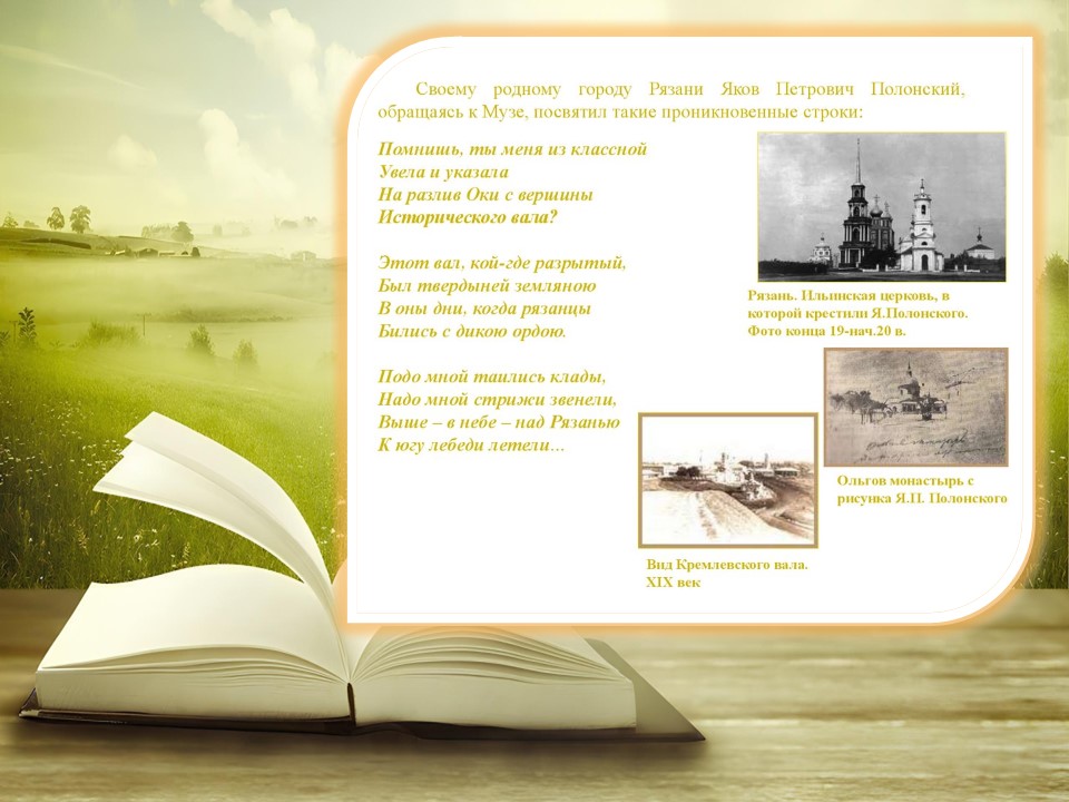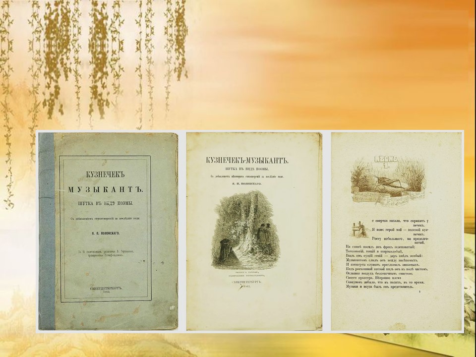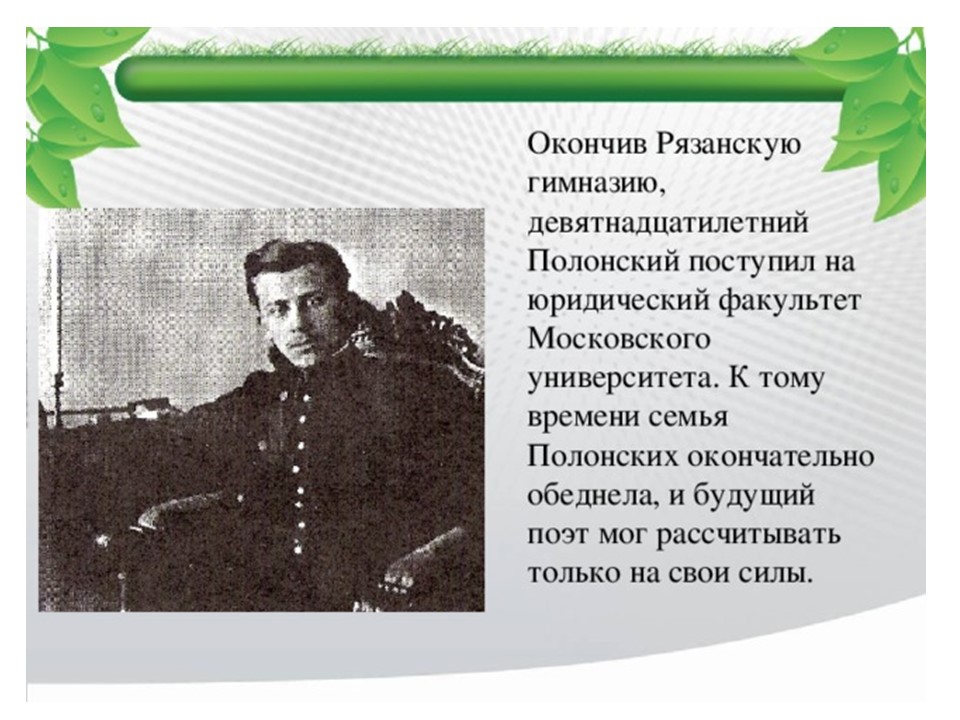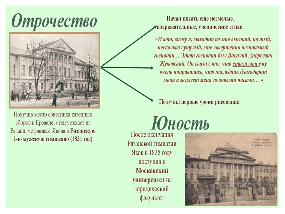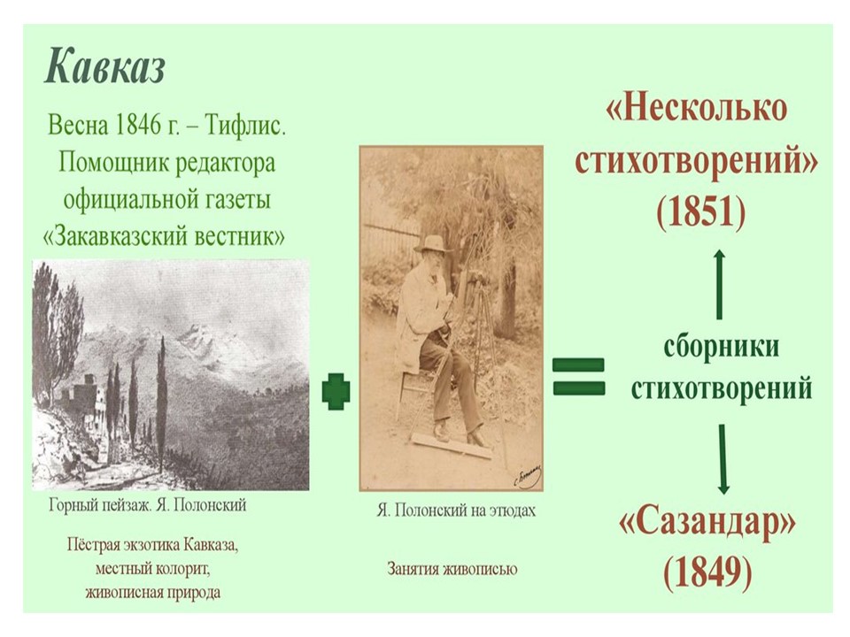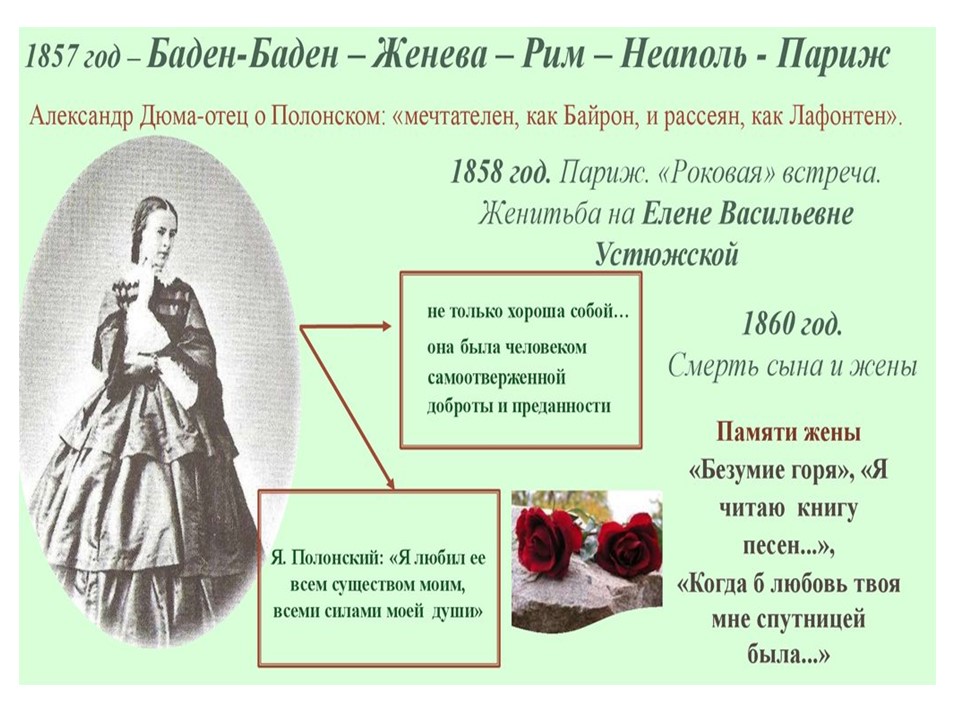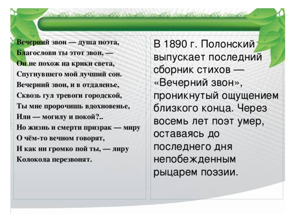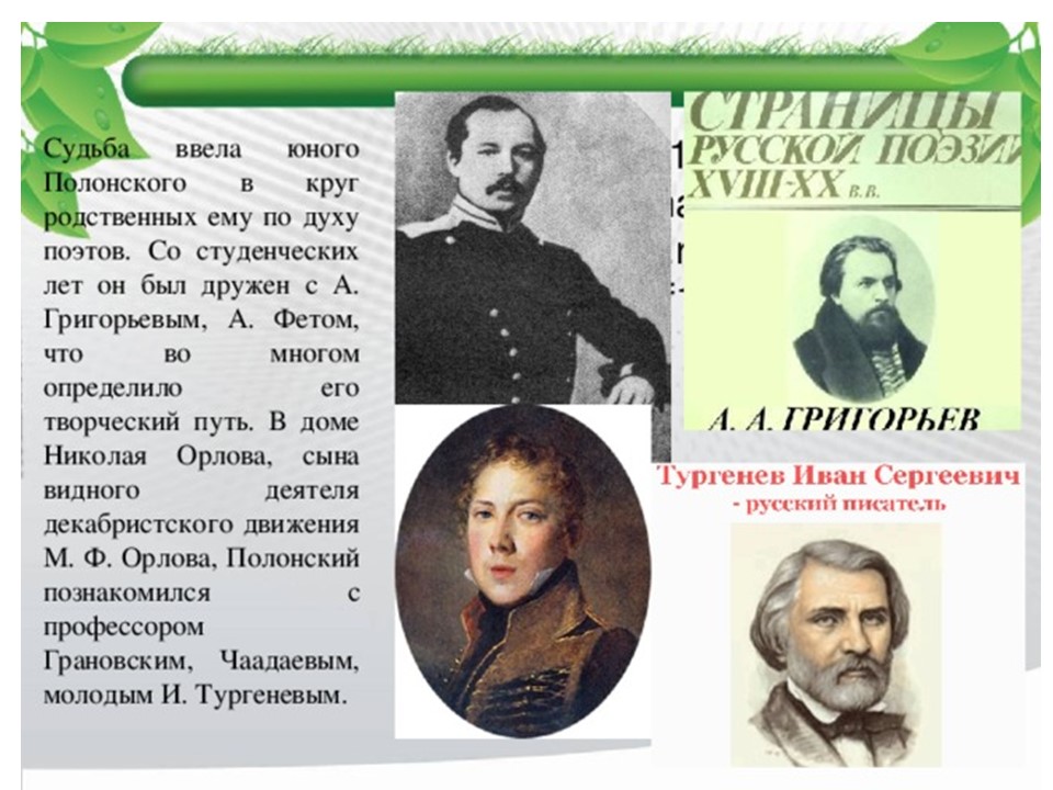 Я́ков Петро́вич Поло́нский (1819-1898) — русский поэт и прозаик. Член-корреспондент Петербургской академии наук (1886). Литературное наследие Полонского велико и включает в себя несколько сборников стихотворений, многочисленные поэмы, романы и рассказы. Множество его стихотворений было положено на музыку выдающимися русскими композиторами, ставших популярными романсами.