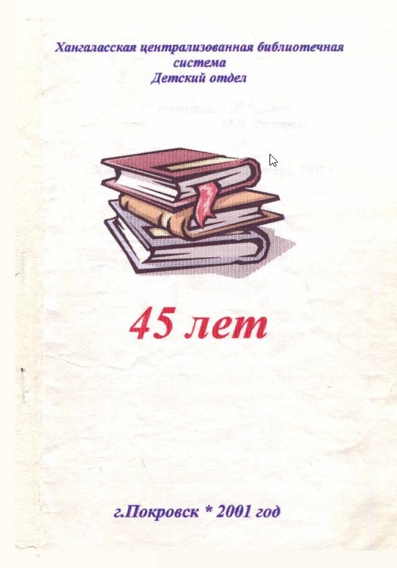 45 лет : история Покровской детской библиотеки : [метод. отдел. Хангалас. централиз. библ. системы / сост. Г. Е. Ильина] – Покровск, 2001 – 32 с.