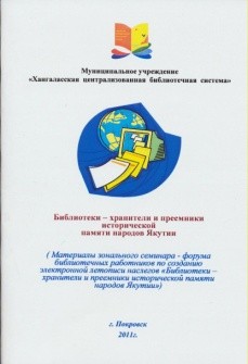 Библиотеки – хранители и преемники исторической памяти народов Якутии : cб. материалов зонального семинара-форума библ. работников по созданию электр. летописи наслегов [метод. отдел Хангалас. централиз. библ. система / сост. Свинобоева Т. Г., Колесова Л. Н.] – Покровск, 2011. – 36 с.