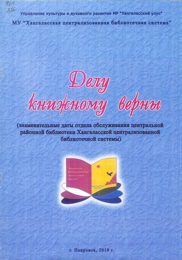 Делу книжному верны : знамен. даты отдела обслуживания центр. районной б-ки Хангалас. централиз. библ. система / [сост.: Свинобоева Т. Г., Шеликпаева А. Н.; Управление культуры и духовного развития МР «Хангаласский улус»; МУ «Хангалас. централиз. библ. система»]. – Покровск, 2010. – 32 с.