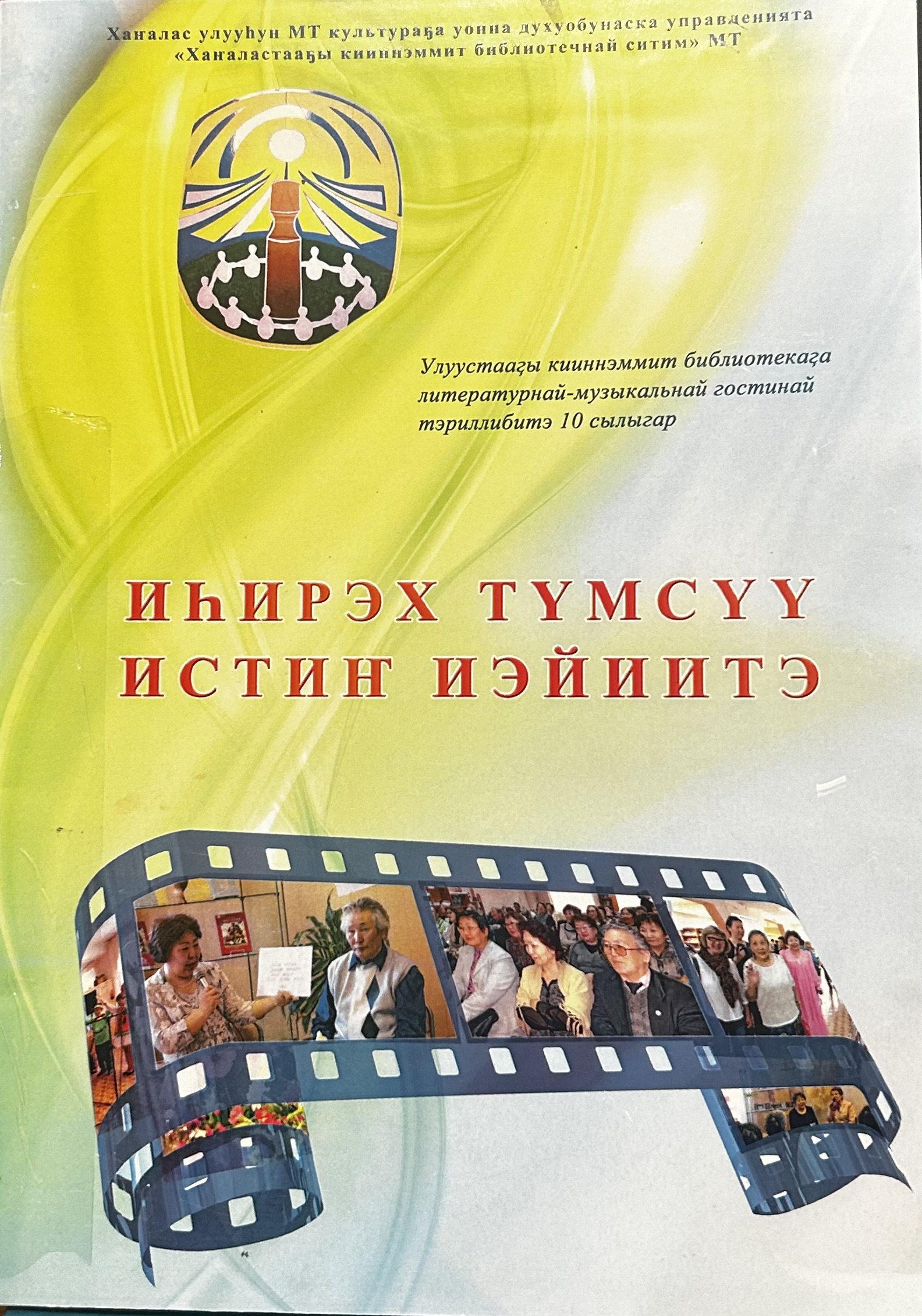 Иһирэх түмсүү истиҥ иэйиитэ : лит.-муз. гостинай 10 сылыгар улуустааҕы библиотекаҕа/ [хомуйан оҥордо Л. Н.. Колесова]. – Покровскай, 2014. – 52 с.