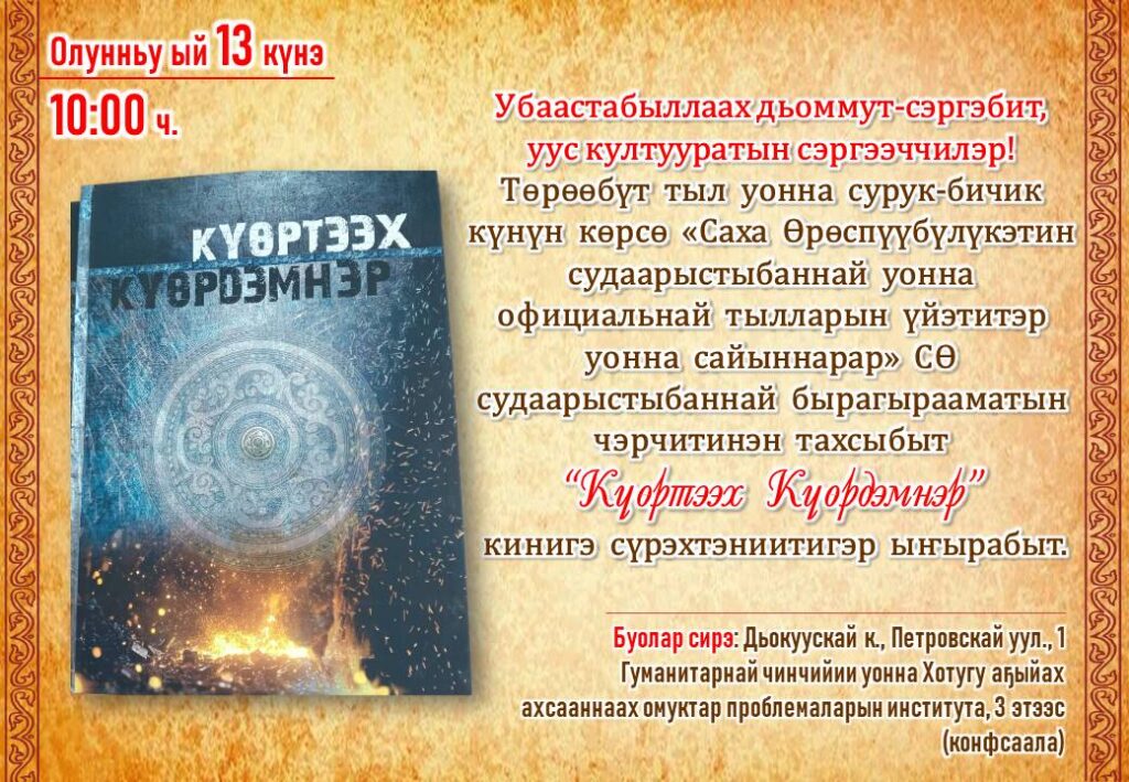 Күөрдэммит ытык- мааны дьоно -сэргэтэ олунньу 13 күнүгэр, гуманитарнай чинчийии институтугар буолар Күөртээх Күөрдэмнэр кинигэ сүрэхтэниитигэр ыҥырабыт. Кинигэ төрөөбүт тылбытын харыстыыр, уус култууратын үйэтитэр сыаллаах Гуманитарнай институту кытта сэргэ нэһилиэк үлэлэспит республикаҕа бастакы уопут быһыытынан тахсар. Бу үлэ сүнньүнэн уһуйаан, оскуола оҕолоругар аналлаах 120 ахс остуол оонньуута, 300 ахс.кинигэ СӨ государственнай уонна официальнай тылларыы сайыннарыы диэн программанан үбүлэнэн биһи туһабытыгар буор босхо оҥоһулуннулар. Онон нэһилиэкпит дьоно-сэргэтэ улахан бырайыакка үлэлээбит, үлэни научнай сүрүннээбит убаастанар дьоҥҥо махтал , эҕэрдэ тылгытын этэ кэлиэххит диэн эрэнэбит.