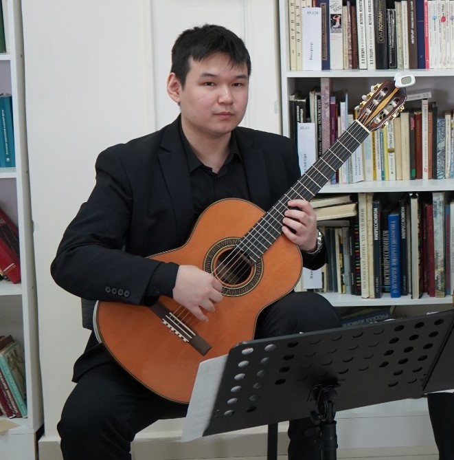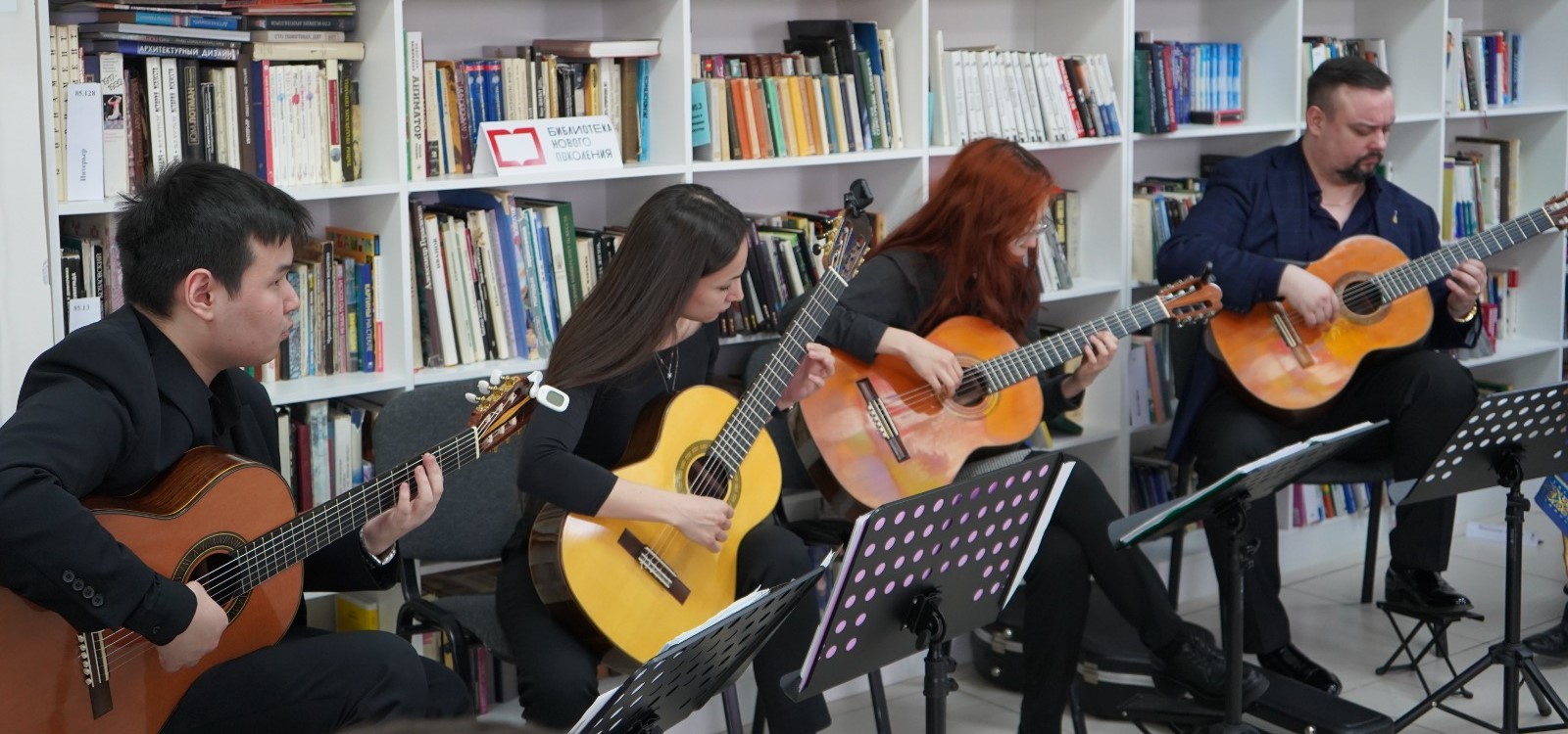 Владислав Владимирович со своими учениками Дарьей Ивановой, Анжеликой Бойко и Василием Афанасьевым исполнили завораживающую классику и музыку песен военных лет. Ребята в беседе с гостями узнали секреты игры на гитаре, о том, как выбрать инструмент, который станет частью души, и, конечно, о студенческой жизни в АГИКИ.
