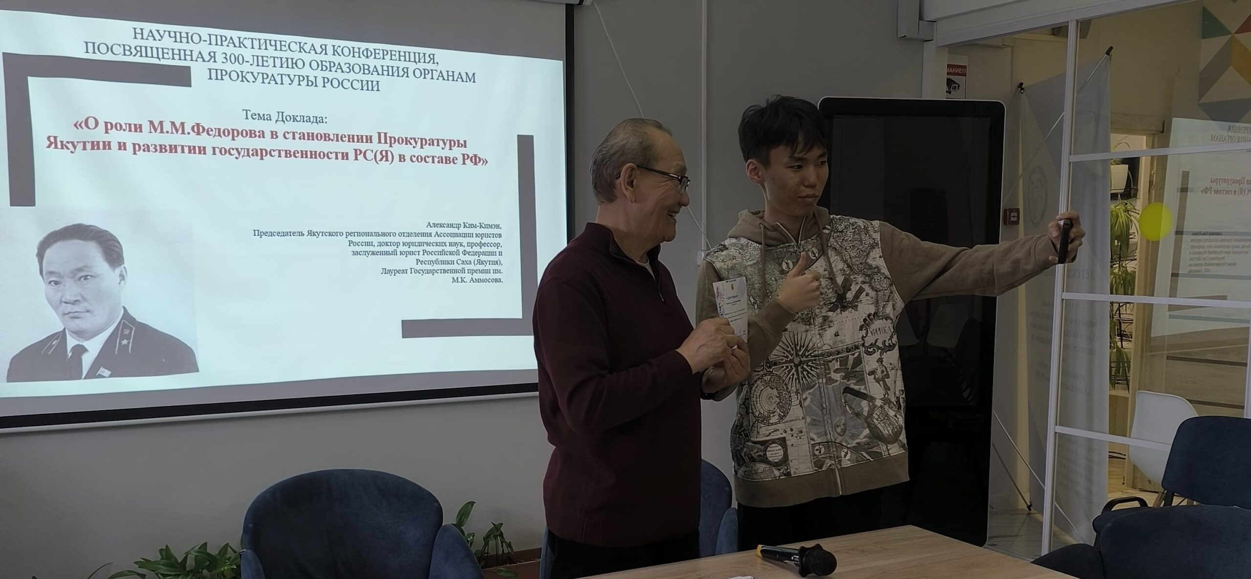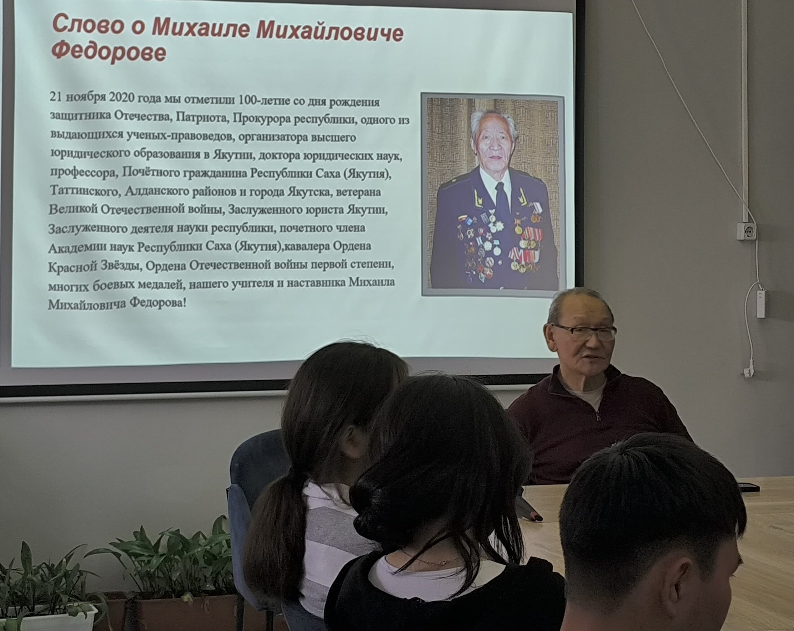 Александр Николаевич рассказал об известных юристах, стоявших у истоков создания юридического факультета Якутского государственного университета, ныне СВФУ, людях, которые взрастили не одно поколение служителей права республики. Рассказ о пути в юриспруденции и жизни доктора юридических наук, участнике Великой Отечественной войны, первом декане факультета Федорове М.М. и его сподвижнике Миронове Д.Н. заинтересовал слушателей. На примере героев лекции прошло становление многих известных юристов Якутии и они служат ориентиром для молодежи, которые видят свое будущее в юриспруденции и правоохранительных органах. Свой первый шаг к мечте сделали выпускники Академии. Александр Ким-Кимэн с пожеланиями успехов вручил троим слушателям сертификаты об окончании Детской Академии права при Центральной районной библиотеке. Также Александр Николаевич вручил Почетную грамоту Государственного комитета юстиции Республики Саха (Якутия) куратору Академии, нашей коллеге Наталие Филипповне Скрябиной.