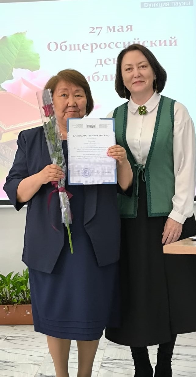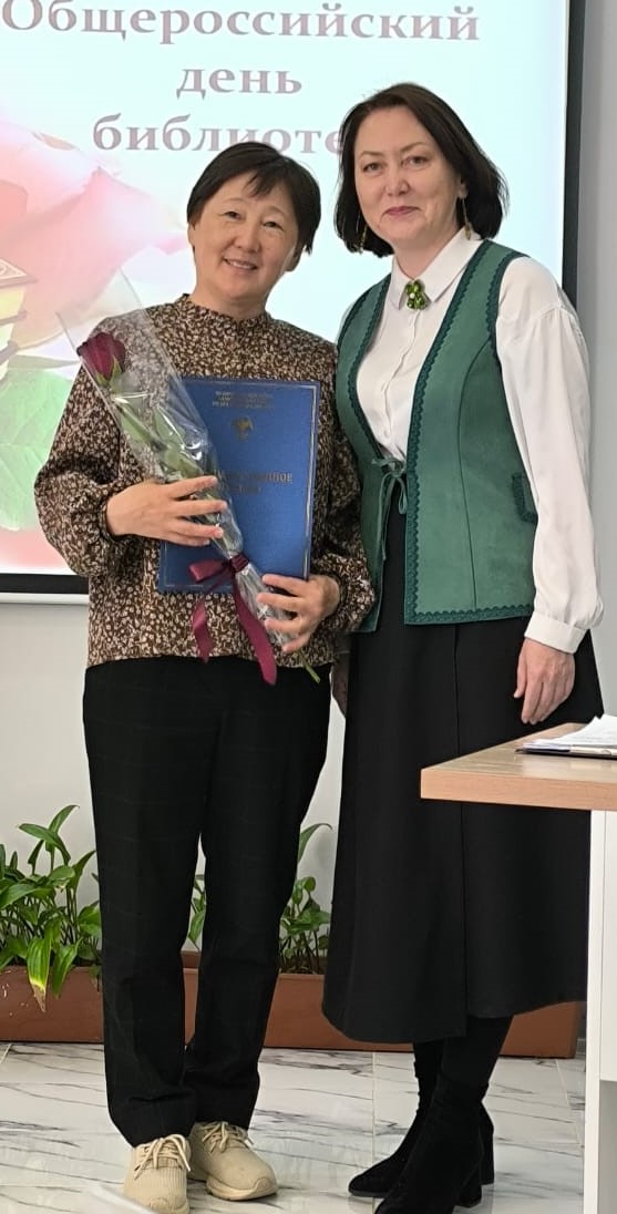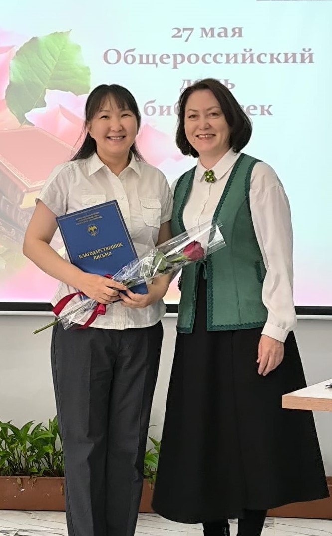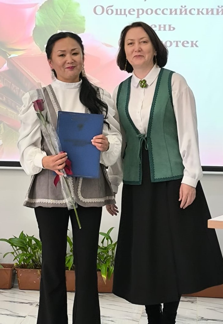За высокий профессионализм, творческую инициативу, активную культурно-просветительскую деятельность Благодарственное письмо главы улуса вручается Васильевой Эмилии Николаевне, библиотекарю Немюгюнской сельской модельной библиотеки, Новоприезжей Александре Яковлевне, библиотекарю отдела обслуживания Центральной районной библиотеки, Дьяконовой Анисии Алексеевне, заведующей Булгунняхтахской сельской модельной библиотеки №9.